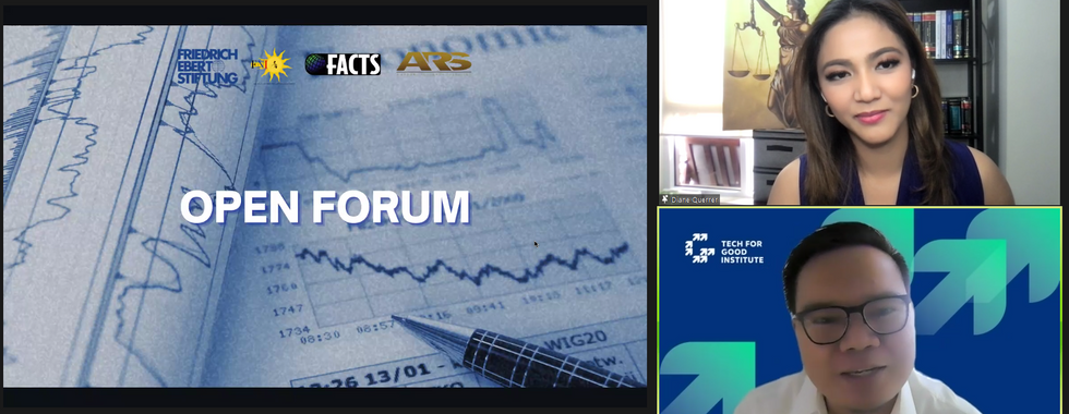 Resource speakers include: Department of Information and Communications Technology (DICT) Undersecretary Jocelle Batapa-Sigue, co-founder and Member of the Board of Directors of the National ICT Confederation of the Philippines (NICP); Ms. Jean Clarisse Carlos, Project Development Officer IV handling the Philippine APEC Study Center Network (PASCN) Network of East Asian Think-Tanks Philippines (NEAT), and East Asian Development Think-Tanks (EADN) Secretariats at the Philippine Institute for Development Studies (PIDS); and Mr. Keith Detros previously a digital economy specialist at the U.S. Department of State’s Embassy in Manila and current Programme Lead at the Tech for Good Institute. The webinar was moderated by PTV News Anchor, Ms. Diane Querrer with opening remarks from Mr. Mirco Gunther, Head of Asia-Pacific Department at Friedrich-Ebert-Stiftung (FES) Philippines and closing remarks from VADM Jose Luis Alano (Ret.), FNI Chairman of the Board.